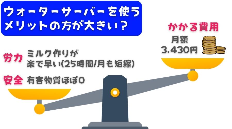 特に授乳回数が多く、赤ちゃんの抵抗力が低い0~1歳の期間だけでも、無理をせずウォーターサーバーを使ったほうがいいと思います。