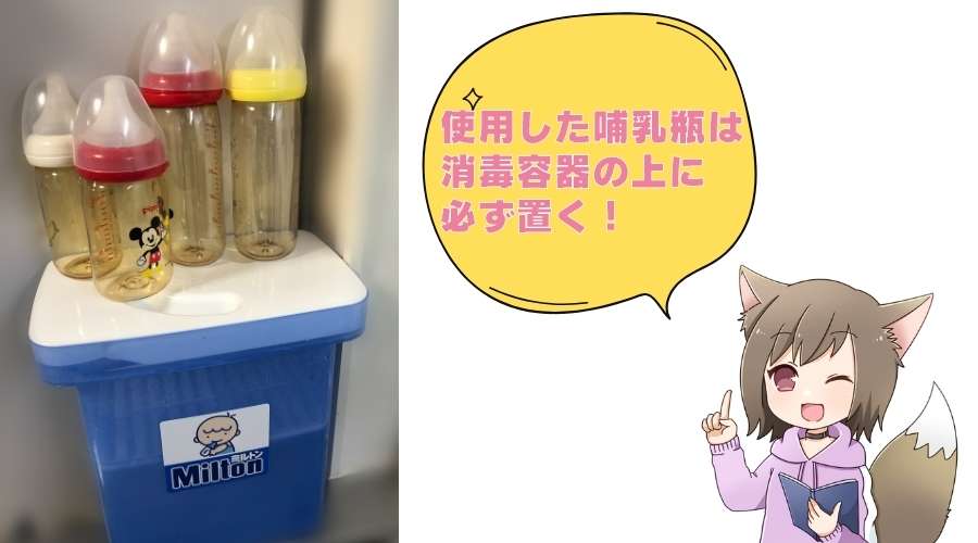 使用した哺乳瓶は、すぐに消毒容器の上に置くようにします。こうしてたまった哺乳瓶をまとめて洗浄 ➔ 消毒する流れだと忘れることはないです。
